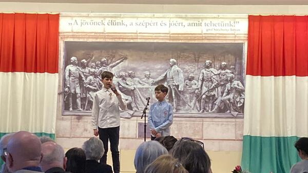 Az ünnepség főkonzuli köszöntővel kezdődött, majd közösen elénekeltük a Kossuth Lajos táborában című dalt. A műsor során elhangzott Arany János Széchenyi emlékezete  és Illyés Gyula Széchenyi hídja című verse. Egy Mozart zongoradarab tette még emelkedettebbé az ünnep hangulatát. Két, korabeli ruhát viselő felnőtt színészi előadása, az „Egy esztendő jövedelme” című jelenet különösen érdekes volt számunkra, amelyben Széchenyi István felajánlja egyévi jövedelmét a Magyar Tudós Társaság megalapítására, ezzel is támogatva a magyar nyelv és a tudomány fejlődését. Ez a hatalmas összegű és önzetlen felajánlás nagyon elgondolkodtatott bennünket. Ketten elszavaltuk Vörösmarty Mihály Szózat című versét a színpadon, mely méltó és megható pillanata volt az ünnepségnek.