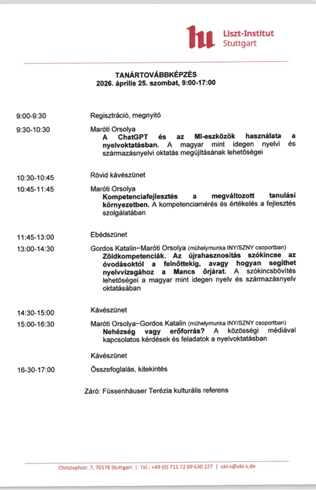 A mesterséges intelligencia: kihívás és lehetőség a nyelvoktatásban címmel 2026. április 25.-én, szombaton a stuttgarti Liszt Intézetben továbbképzésen vettek részt iskolánk pedagógusai. Dr. Maróti Orsolya és Gordos Katalin az előadáson és a műhelymunka során nemcsak egy aktuális lehetőséget mutatott be az oktatásban, hanem annak buktatóit is.